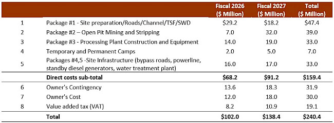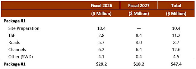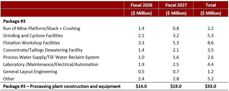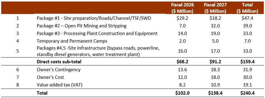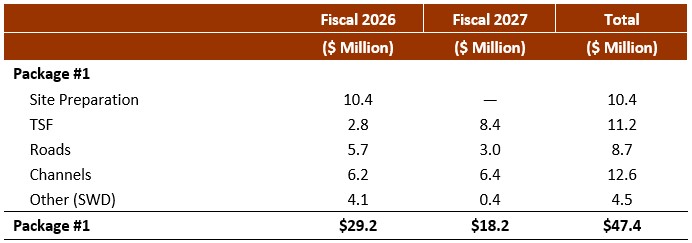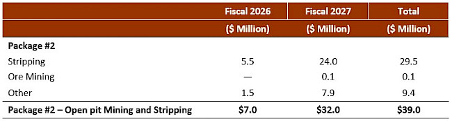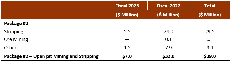 The cost estimates are based on the optimized mine plan, which is based on the 2021 Feasibility Study, and the initial quotations received from interested contractors on a “Unit Cost” basis, that is the cost of drilling blasting and removing each cubic metre of rock a certain distance. The Company has not yet awarded the commercial contract for Package #2. The table below summarizes the estimated schedule and costs for Package #2.