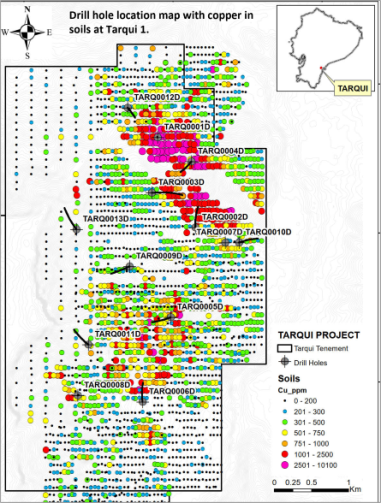 - Drill intercepts confirming porphyry-style mineralization including 218 metres grading 0.32% CuEq from surface in hole TARQ4D (reported in a press release dated July 11, 2022, by previous owner Luminex Resources Corp. (“Luminex”)):