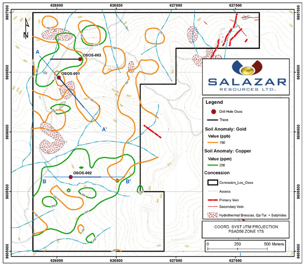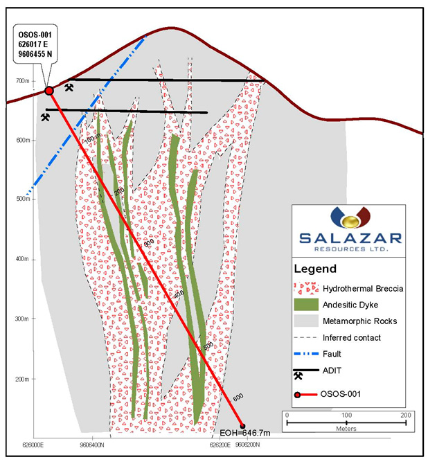 VANCOUVER, BRITISH COLUMBIA, February 12, 2021 -- SALAZAR RESOURCES LIMITED (TSXV: SRL) (Frankfurt: CCG.F) (“Salazar” or the "Company") reports initial assay results from the wholly-owned Los Osos project in El Oro, Ecuador. The first two holes, OSO-01 and OSO-02 were completed in December 2020, at depths of 644 meters (“m”) and 576 m respectively. The holes focused on hydrothermal breccias and intrusive diorites with porphyry copper-gold potential. Encouragingly, the drilling has intercepted significant zones of mineralization that are consistent with a large-scale gold system with 244 m of broad mineralization encountered in drill hole OSO-01.