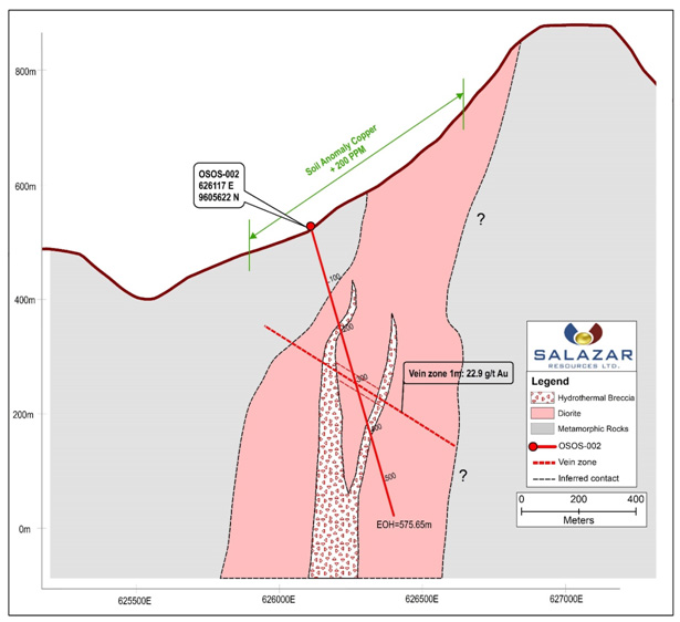 Fredy E. Salazar, CEO, commented: “Los Osos is the first 100% Salazar Resources-owned project that we have drilled since 2017, and we are encouraged that the first hole intersected continuous mineralization from surface for 244 meters, and that OSO-02 intersected high-grade gold in veins. The Cangrejos-Portovelo region is host to both significant gold-copper porphyry deposits as well as high grade vein structures. We look forward to completing this Phase 1 program soon, as part of what is going to be an extremely active year for the company.”
