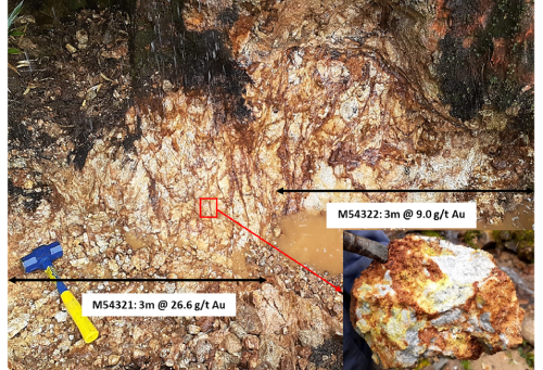 Samples 54321 and 54322 show excellent gold grades, returning 3 m @ 26.6 g/t Au and 3 m @ 9.0 g/t Au in rock chips respectively. These samples were located at the site of artisanal activity, at the lower portion of an area of the lithocap (see photograph below).
