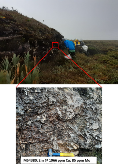 Samples 54312 and 54315 were located on a series of porphyry outcrops, both returning 0.2% copper over several meters of rock chip. Of particular interest is the silver content (51.9 g/t Ag) in sample 54312, and the fact that traces of bornite were visible in sample 54315. Samples 54379 and 54380 were taken on a stockwork zone within porphyry and showed evidence of elevated molybdenum in the system (see photograph below).