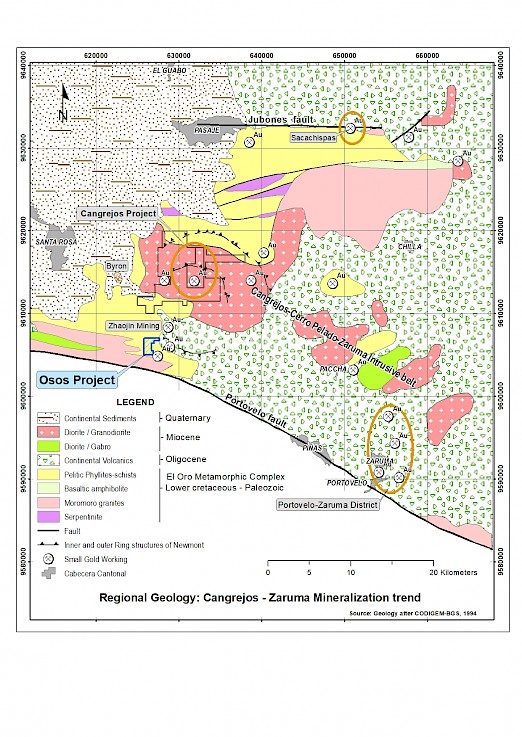 The property is located in the Miocene Porphyry belt of Ecuador which is becoming an increasingly important zone of discoveries. It sits at the western end of the Cangrejos Zaruma intrusive belt in southern Ecuador. This geologic belt is typified by multiple nested late Oligocene to Early Miocene intrusions, punctured and intruded by a number of porphyry dikes and breccia pipes The approximately 20 Ma age of the intrusions in the Zaruma intrusive belt is the same as that of the giant Chilean porphyries which range in age from 10-40 Ma years(1).