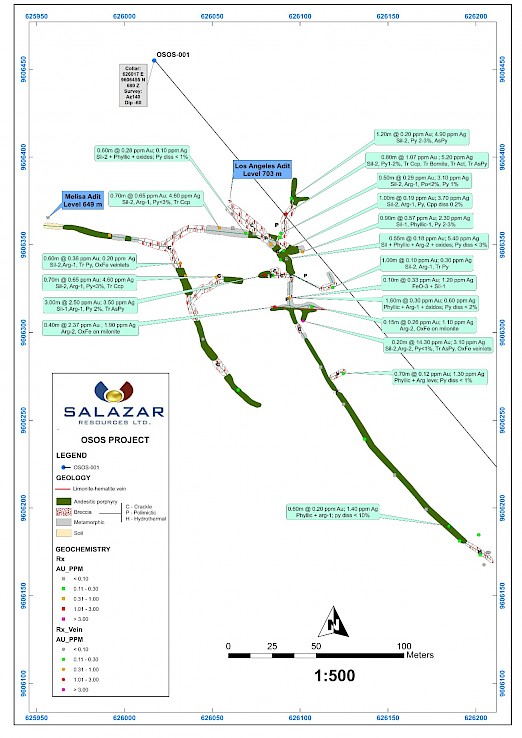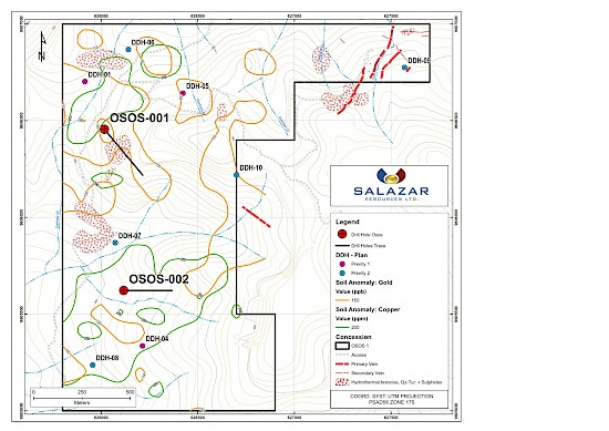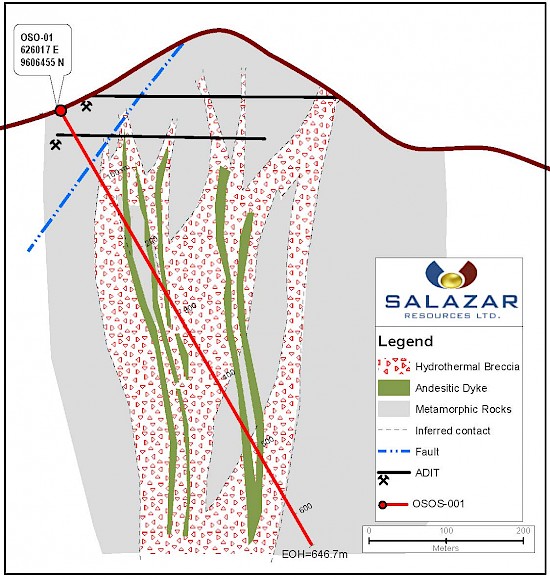 OSO-01 is the first diamond drillhole on the Los Osos project. The hole is collared in metamorphic host rock and oriented 140o to the southeast below artisanal workings (also in the breccias), and coincident copper and gold geochemical anomalies. The hole was planned to be 500 m inclined at -60o to reach a depth of 433 m below surface, and to traverse 250 m horizontally. Given that OSO-01 has intersected consistently mineralized lithologies, the hole continued to the limit of the capabilities of the drill rig at 647 m. https://www.salazarresources.com/projects/100-salazar-owned/los-osos/