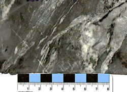 The metamorphic host rocks (photo 1) intersected in OSO-01 are predominantly comprised of psammites with minor pelites, grouped together as metamorphic quartzites for simplicity. The quartzites are silicified and have disseminated fine-grained sulphides throughout.