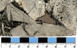 Description: Hydrothermal Breccia mosaic texture, monomictic quartzite angular clasts. Fine tourmaline matrix with pyrrhotite, chalcopyrite, pyrite and +/- sericite | Description: Porphyritic texture, altered amphibole phenocrysts and corroded edges. Fine crystal matrix. Quartz-sericite-illite overprint with traces of remnant biotite-chlorite alteration. Disseminated sulphides pyrrhotite, pyrite and lesser chalcopyrite |